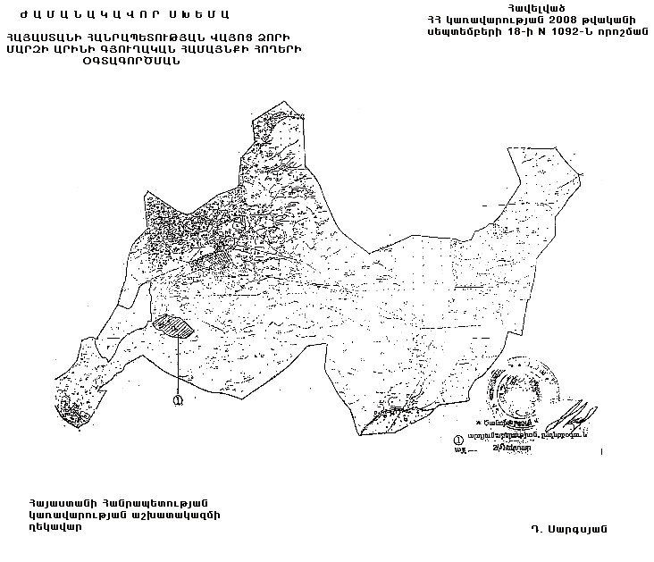 1. Հայաստանի Հանրապետության կառավարության 2003 թվականի հուլիսի 10-ի N 863-Ն որոշմամբ հաստատված` Հայաստանի Հանրապետության Վայոց ձորի մարզի Արինի գյուղական համայնքի հողերի օգտագործման ժամանակավոր սխեմայում` համաձայն հավելվածի, համայնքային սեփականություն հանդիսացող` գյուղատնտեսական նշանակության հողերից 21.5 հեկտար արոտավայրերը փոխադրել արդյունաբերության, ընդերքօգտագործման և այլ արտադրական նշանակության օբյեկտների հողերի կատեգորիա, այդ թվում` 2 հեկտարը` գործարանի, 19.5 հեկտարը` պոչամբարի կառուցման համար:
