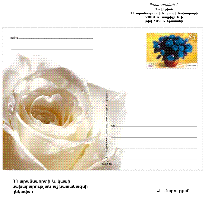 2. Գործողության մեջ դնել կանանց և մայրության տոնին նվիրված նամականիշով միակողմանի բացիկը, սահմանելով անվանագինը 85 դրամ, տպաքանակը` 2200 հատ: