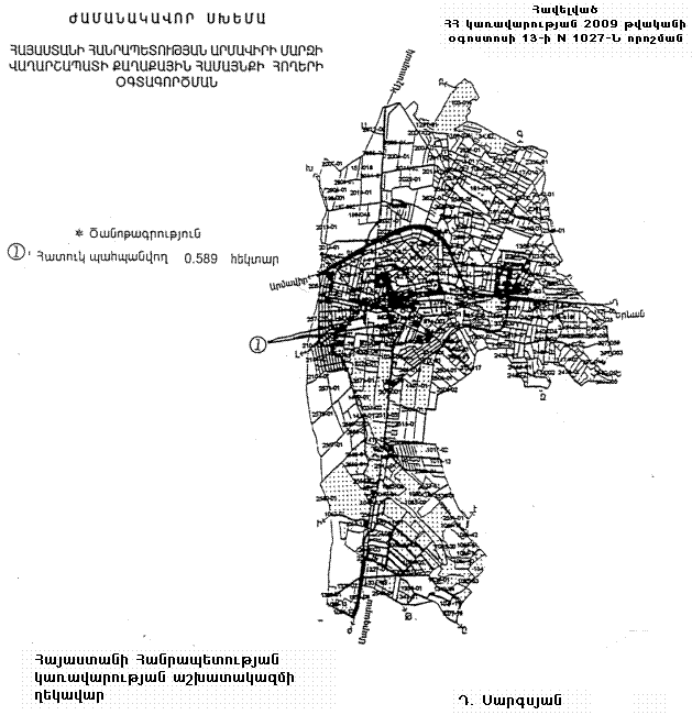 1. Հայաստանի Հանրապետության կառավարության 2007 թվականի օգոստոսի 16-ի N 926-Ն որոշմամբ հաստատված` Հայաստանի Հանրապետության Արմավիրի մարզի Վաղարշապատի քաղաքային համայնքի հողերի օգտագործման ժամանակավոր սխեմայում` համաձայն հավելվածի, 0.589 հեկտար հողերը փոխադրել հատուկ պահպանվող տարածքների հողերի կատեգորիա, այդ թվում`