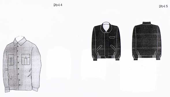 2) բաճկոն` մուգ կապույտ կիսաբրդյա կտորից, ուրվագիծը` ուղիղ: Լանջափեշերի կրծքամասում մշակված են շերտակարով, կոճկվող կափույրով վրադիր գրպաններ: Գոտկատեղում մշակված է էլաստիկ ժապավենով գոտի: Բաճկոնի օձիքը` շրջվող (լածկանով), թևքերը` երկկարանի, հետևամասը` վերին կտրվածքով, որի միջով անցնում է 2 մմ լայնությամբ նարնջագույն եզրաքուղ: Բաճկոնը կոճկվում է լանջափեշերի տակ ներկարված շղթայով, աստառը` մետաքսյա, ձախ կողմում` ծոցագրպան (N 2 ձև).