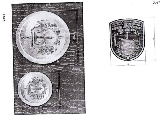 3. Հայաստանի Հանրապետության դատական դեպարտամենտի դատական կարգադրիչների ծառայության խորհրդանշանը ոլորապտույտ շրջանակ է, որի ներսում գրված են «ԴԱՏԱԿԱՆ ԿԱՐԳԱԴՐԻՉՆԵՐԻ ԾԱՌԱՅՈՒԹՅՈՒՆ» բառերը: Շրջանակի կենտրոնական մասում պատկերված են սուր և վահան` պատված դափնեճյուղերով (սուրը խորհրդանշում է կարգադրիչների` հատուկ միջոցներ կիրառելու լիազորությունը, իսկ վահանը` անձանց կյանքի, առողջության և արժանապատվության, իրավունքների ու ազատությունների պաշտպանությունը հանցավոր և այլ հակաիրավական ոտնձգություններից, դափնեճյուղերը` կարգադրիչների ծառայության կառուցվածքը): Վահանի միջով անցնող սուրը խորհրդանշանի վրա երևում է իր ծայրով և բռնակով: Վահանի վրա առկա է կշեռքը, որը խորհրդանշում է արդարադատությունը (N 12 ձև):