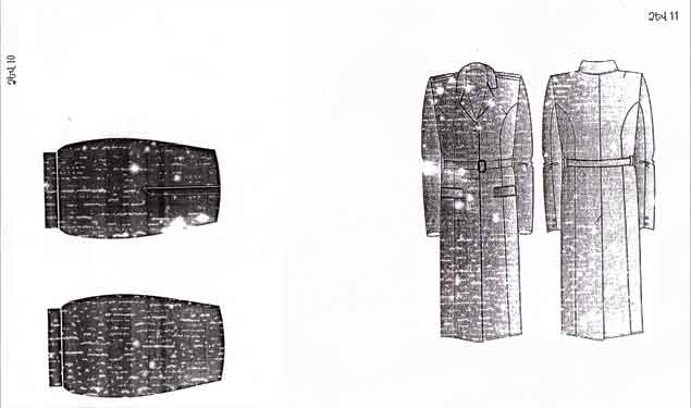 6) ձմեռային վերարկու` մուգ կապույտ կիսաբրդյա կտորից, ուրվագիծը` կիսանստած, հետևամասի և լանջափեշերի վրա վերևից ներքև` ռելիեֆային կարեր, լանջափեշերի գրպանատեղում ներկարված են կտրվածքով գրպաններ, թևքերը ներկարված են, ուղիղ, օձիքը` ծալվող: Վերարկուն մշակված է տաք ներդիրով և մետաքսե աստառով: Վերարկուի հետևամասի ներքևը մշակված է կտրվածքով (N 11 ձև).