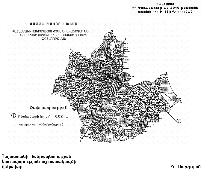 1. Հայաստանի Հանրապետության կառավարության 2005 թվականի մայիսի 5-ի N 564-Ն որոշմամբ հաստատված` Հայաստանի Հանրապետության Արագածոտնի մարզի Աշտարակի քաղաքային համայնքի հողերի օգտագործման ժամանակավոր սխեմայում` համաձայն հավելվածի, քաղաքացու սեփականություն հանդիսացող` գյուղատնտեսական նշանակության 0.02 հեկտար վարելահողը փոխադրել բնակավայրերի հողերի կատեգորիա` բնակելի կառուցապատման համար: