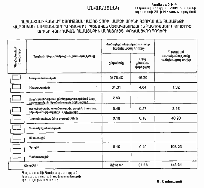 4. Ընդունել ի գիտություն Հայաստանի Հանրապետության Վայոց ձորի մարզի Արինի գյուղական համայնքի հողային ֆոնդի առկայության և բաշխման մասին հաշվետվությունը՝ 2005 թվականի հունվարի 1-ի դրությամբ՝ համաձայն NN 8 և 9 հավելվածների: