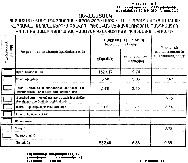 4. Ընդունել ի գիտություն Հայաստանի Հանրապետության Վայոց ձորի մարզի Սալլիի գյուղական համայնքի հողային ֆոնդի առկայության և բաշխման մասին հաշվետվությունը` 2005 թվականի հունվարի 1-ի դրությամբ` համաձայն NN 8 և 9 հավելվածների: