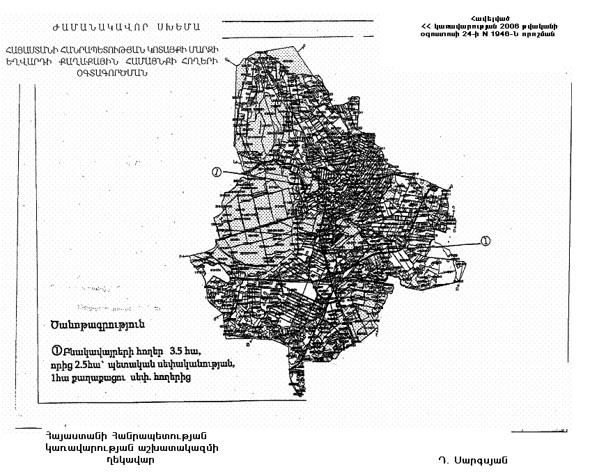 Հայաստանի Հանրապետության կառավարության 2002 թվականի օգոստոսի 29-ի N 1350-Ն որոշմամբ հաստատված` Հայաստանի Հանրապետության Կոտայքի մարզի Եղվարդի քաղաքային համայնքի հողերի օգտագործման ժամանակավոր սխեմայում` համաձայն հավելվածի պետական սեփականություն հանդիսացող` գյուղատնտեսական նշանակության հողերից 2.5 հեկտարը, քաղաքացիների սեփականությունը հանդիսացող` գյուղատնտեսական նշանակության հողերից մեկ հեկտարը փոխադրել բնակավայրերի հողերի կատեգորիա։