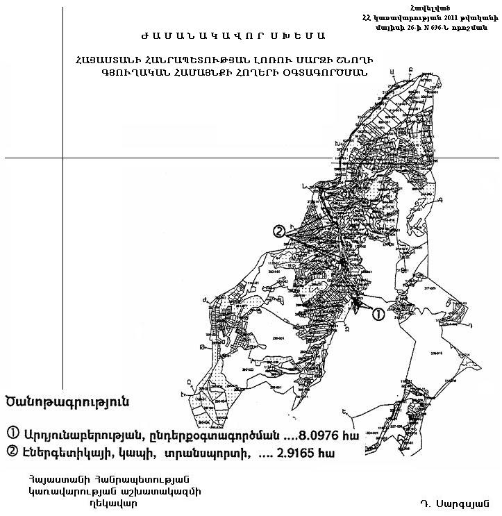 1) գյուղատնտեսական նշանակության հողերից 8.0976 հեկտար, այդ թվում՝ 0.7712 հեկտար վարելահող, 0.368 հեկտար պտղատու այգի, 0.0804 հեկտար խոտհարք, 6.878 հեկտար արոտավայր` արդյունաբերության, ընդերքօգտագործման և այլ արտադրական նշանակության օբյեկտների հողերի կատեգորիա` Հայաստանի Հանրապետության օրենսդրությամբ սահմանված կարգով շինարարական բազա կառուցելու համար.