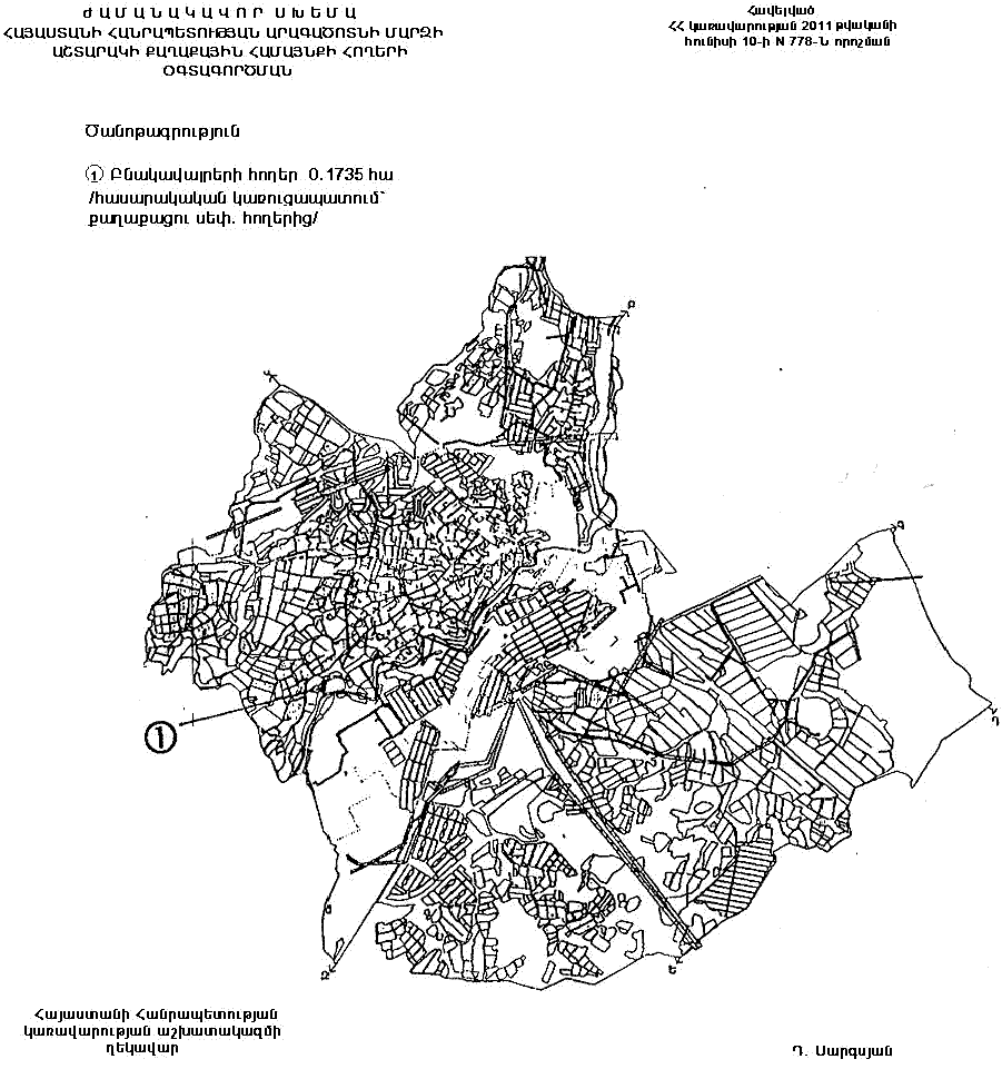 1. Հայաստանի Հանրապետության կառավարության 2005 թվականի մայիսի 5-ի N 564-Ն որոշմամբ հաստատված` Հայաստանի Հանրապետության Արագածոտնի մարզի Աշտարակի քաղաքային համայնքի հողերի օգտագործման ժամանակավոր սխեմայում` համաձայն հավելվածի, քաղաքացու սեփականությունը հանդիսացող` գյուղատնտեսական նշանակության 0.1735 հեկտար հողերը, այդ թվում` 0.0145 հեկտար պտղատու այգին, 0.159 հեկտար արոտավայրը փոխադրել բնակավայրերի հողերի կատեգորիա` Հայաստանի Հանրապետության օրենսդրությամբ սահմանված կարգով հասարակական կառուցապատման (սննդի օբյեկտ) համար: