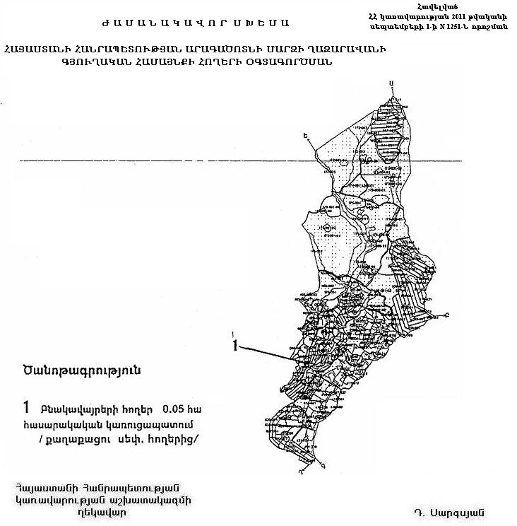 1. Հայաստանի Հանրապետության կառավարության 2003 թվականի հունիսի 26-ի N 784-Ն որոշմամբ հաստատված` Հայաստանի Հանրապետության Արագածոտնի մարզի Ղազարավանի գյուղական համայնքի հողերի օգտագործման ժամանակավոր սխեմայում` համաձայն հավելվածի, քաղաքացու սեփականությունը հանդիսացող՝ գյուղատնտեսական նշանակության վարելահողերից 0.05 հեկտարը փոխադրել բնակավայրերի հողերի կատեգորիա` Հայաստանի Հանրապետության օրենսդրությամբ սահմանված կարգով հասարակական կառուցապատման նպատակով՝ սննդի օբյեկտի կառուցման համար: