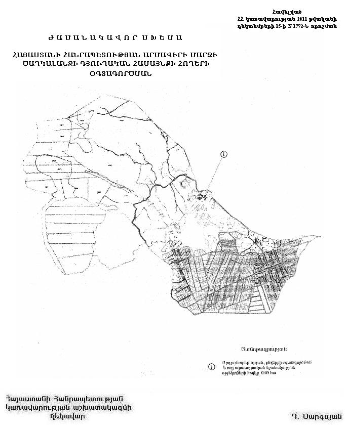 1. Հայաստանի Հանրապետության կառավարության 2003 թվականի դեկտեմբերի 4-ի N 1574-Ն որոշմամբ հաստատված` Հայաստանի Հանրապետության Արմավիրի մարզի Ծաղկալանջի գյուղական համայնքի հողերի օգտագործման ժամանակավոր սխեմայում` համաձայն հավելվածի, քաղաքացու սեփականությունը հանդիսացող` գյուղատնտեսական նշանակության վարելահողից 0.05 հեկտարը փոխադրել արդյունաբերության, ընդերքօգտագործման և այլ արտադրական նշանակության օբյեկտների հողերի կատեգորիա` Հայաստանի Հանրապետության օրենսդրությամբ սահմանված կարգով քարի վերամշակման արտադրամասի կառուցման համար: