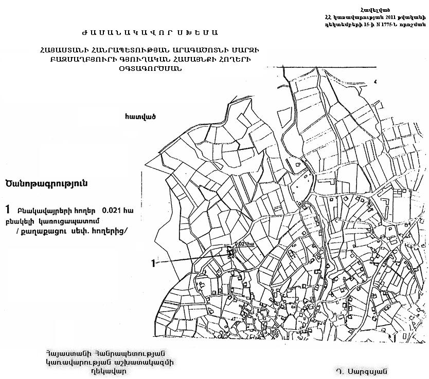 1. Հայաստանի Հանրապետության կառավարության 2002 թվականի հուլիսի 11-ի N 977-Ն որոշմամբ հաստատված` Հայաստանի Հանրապետության Արագածոտնի մարզի Բազմաղբյուրի գյուղական համայնքի հողերի օգտագործման ժամանակավոր սխեմայում` համաձայն հավելվածի, քաղաքացու սեփականությունը հանդիսացող՝ գյուղատնտեսական նշանակության բազմամյա տնկարկից 0.021 հեկտարը փոխադրել բնակավայրերի հողերի կատեգորիա` Հայաստանի Հանրապետության օրենսդրությամբ սահմանված կարգով բնակելի կառուցապատման համար: