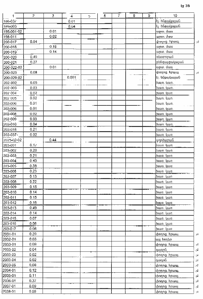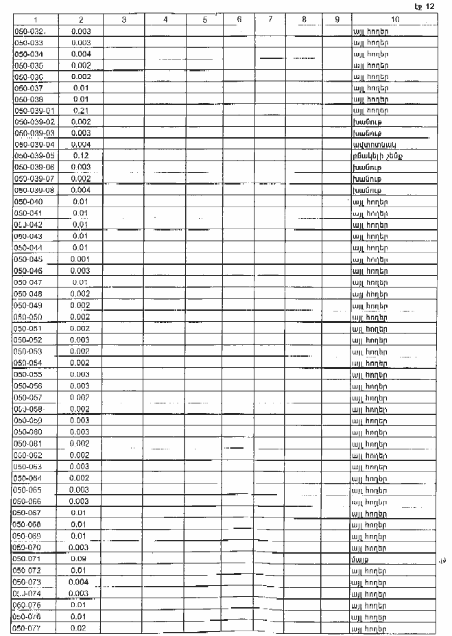 NN Նպա- Գործառական Ընդամենը Սեփականության սուբյեկտը ՀՀ քաղա- ՀՀ իրա- համայն- պետա- օտար- Ա Բ Գ 1 2 3 4 5 6 1.1 1. Գյուղա- վարելահող 2333.99 1925.87 282.90 125.22 1.2 բազմամյա տնկարկներ, 170.12 170.12 0.00 1.2.1 այդ թվում` 21.73 21.73 1.2.2 խաղողի այգի 148.39 148.39 1.2.3 այլ 1.3 խոտհարք 0.00 1.4 արոտ 1.5 այլ հողատեսքեր 1 ընդամենը 2504.11 2095.99 282.90 125.22 2.1 2. Բնակա- բնակելի կառուցապատման 430.00 430.00 2.1.1 այդ թվում` տնամերձ հողեր 430.00 430.00 2.1.2 այգեգործական 2.2 ընդհանուր օգտագործման 2.3 այլ հողեր 2 ընդամենը (2.1+2.2+2.3) 430.00 430.00 3 3. Արդյունաբերության, ընդերքօգտագործման և այլ 4 4. Էներգետիկայի, տրանսպորտի, կապի և կոմունալ ենթակառուցվածքների օբյեկտների 5 5. Հատուկ պահպանվող տարածքների 6 6. Հատուկ նշանակության 7.1 7. Անտառային անտառ 7.2 թփուտ 7.3 վարելահող 7.4 խոտհարք 7.5 արոտ 7.6 այլ հողեր 7 ընդամենը 8 8. Ջրային 9 9. Պահուստային ԸՆԴԱՄԵՆԸ` ՈՌՈԳՎՈՂ ՀՈՂԵՐ 2934.11 2525.99 282.90 125.22