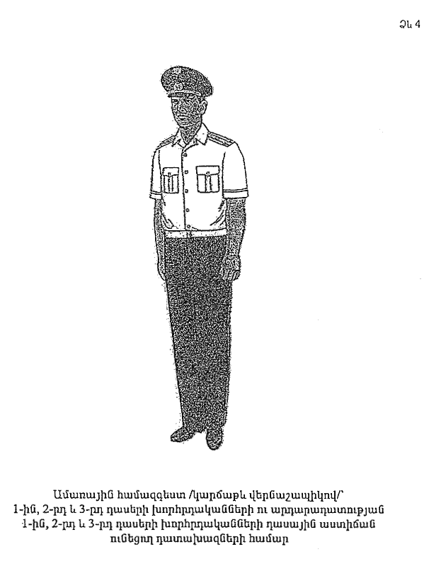 9. Վերնաշապիկ` կարճաթև` սպիտակ կտորից է, ծալովի օձիքով, կրծքամասում` կոճակով կոճկվող կափույրով և շերտակարով վրադիր գրպաններ: Ուղիղ գոտիով, կարագծերին էլաստիկ ժապավեններ: Հետևամասը` վերին կտրվածքով: Կոճկվում է 8 կոճակով: Ձախ կտրվածքը` շերտակարով: Թևքերը կարճ, ուղիղ թևքածալերով: Ուսերին` գոտեմակօղեր` ուսադիրների համար: Երկարաթև վերնաշապիկները կրում են բոլոր կոճակները կոճկված, փողկապով (NN 1 և 2 ձևեր), իսկ կարճաթև վերնաշապիկները` առանց փողկապի, ուսադիրներով, վերևի կոճակն արձակված (NN 3 և 4 ձևեր): Վերնաշապիկի օձիքը հետևից պետք է լինի կիտելի օձիքի վերին ծայրին հավասար, կամ դրանից ոչ ավելի, քան 0.5 սմ բարձր: Կանանց համար վերնաշապիկի ձևը նույնն է` դեպի ձախ կոճկումով: