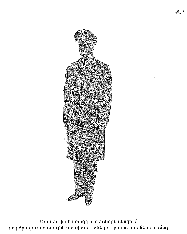 11. Վերարկու` ձմեռային, կիսաբրդյա` ունի 6 ոսկեգույն կոճակ` գրատախլակի վրա: Կոճակների միջև տարածությունը 16-17 սմ է: Բարձրագույն դասային աստիճան ունեցող դատախազների համար վերարկուն գորշ գույնի դրապից է, 1-ին, 2-րդ և 3-րդ դասերի խորհրդականների ու արդարադատության 1-ին, 2-րդ և 3-րդ դասերի խորհրդականների դասային աստիճաններ ունեցող անձանց համար` մուգ կապտագույն դրապից: Վերարկուն կրում են բոլոր կոճակները կոճկված, գրպանների կափույրները դուրս հանված: Հեռավորությունը գետնից միջև տղամարդու վերարկուի ներքևի փեշը պետք է լինի 40 սմ, կանանց վերարկուինը` 38-42 սմ: Վերարկուի հետ կրում են սպիտակ գույնի կաշնե (վզպատ) (NN 5 և 6 ձևեր):