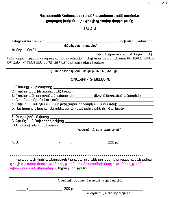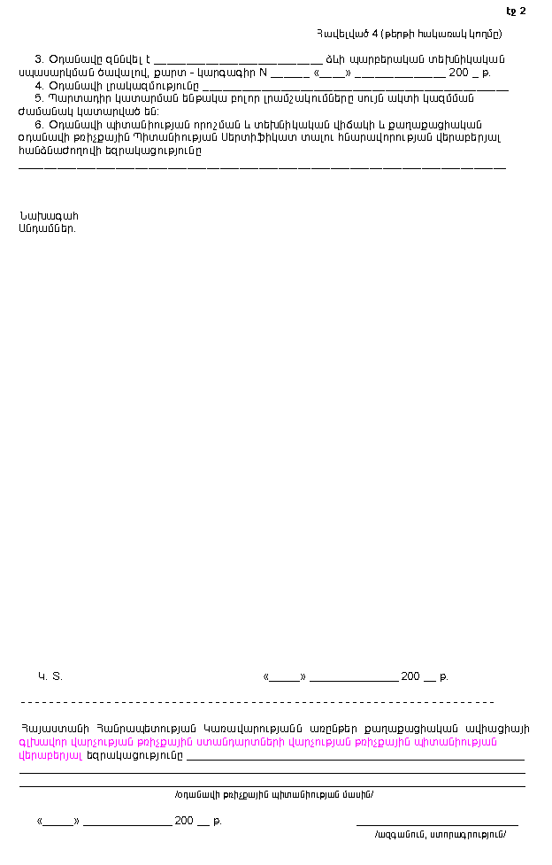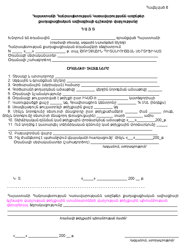 ՕԴԱՆԱՎԻ ԹՌԻՉՔԻ ԹՈՒՅԼՏՎՈՒԹՅՈՒՆ 1. գրանցման նիշերը Nationality and registration marks .................................... 2 օդանավի նշագրումը Manufacturer, manufacturer's designation of aircraft ........................................................................................ ........................................................................................ 3. սերիայի համարը Aircraft serial number .................................... 4. Թույլտվության բովանդակությունը .................................................................................................................. ................................................................................................................................................................................... The permit covers .................................................................................................................................................. ................................................................................................................................................................................... 5. Սահմանափակումներ/Նշումներ Limitation/ Remarks Սույնով ՀՀ կառավարությանն առընթեր քաղաքացիական ավիացիայի գլխավոր վարչությունը ՔԱԳՎ պետի 2004 թվականի դեկտեմբերի 9-ի N 192-Ն հրամանի համաձայն թույլ է տալիս տվյալ ինքնաթիռի ներքոհիշյալ հատուկ պայմաններով թռիչքը ՀՀ օդային տարածքում: Սույն թույլտվությունը գործում է նաև այլ երկրների օդային տարածքներում թռիչքներ իրականացնելու նպատակով՝ տվյալ երկրների համապատասխան մարմինների կողմից լրացուցիչ թույլտվության առկայության պայմանով: The General department of civil aviation at the government of the Republic of Armenia granted by virtue of the Order No. 192-Ն hereby permit noted aircraft to fly within the airspace of the Republic of Armenia. This permit is also valid for flight within other States provided separate approval is obtained from the competent authorities of such States. Թռիչքների անվտանգության տեսչական վարչության պետ Director Flight Safety Inspection Department ........................................................................... (Ստորագրություն, Ազգանուն) (Signature, Name)