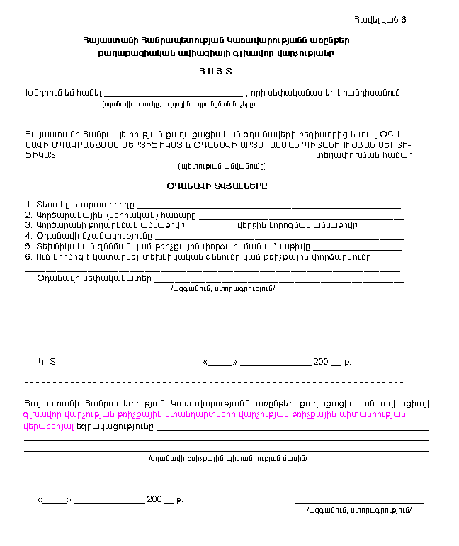 16. Օդանավի սեփականատերը հայտ է ներկայացնում Գլխավոր Վարչություն` օդանավը գրանցելու վերաբերյալ (Հավելված 1):