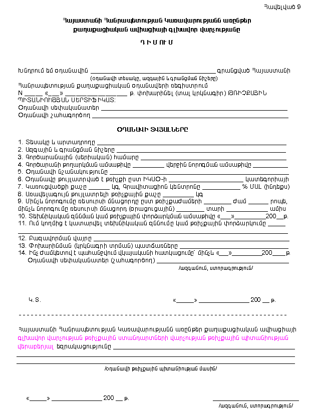ՔԱՂԱՔԱՑԻԱԿԱՆ ՕԴԱՆԱՎԻ ԳՐԱՆՑՄԱՆ ՍԵՐՏԻՖԻԿԱՏ 1. գրանցման նիշերը Nationality and registration marks .................................... 2 օդանավի նշագրումը Manufacturer, manufacturer's designation of aircraft ........................................................................................ ........................................................................................ 3. համարը Aircraft serial number .................................... 4. Categories ................................................................................................................................................... 5. Օդանավի սեփականատերը ......................................................................................................................... Name of owner .............................................................................................................................................. 6. Սեփականատիրոջ գտնվելու վայրը ............................................................................................................ Address of owner ......................................................................................................................................... 7. Օդանավի շահագործողը ............................................................................................................................. Operator of the aircraft ............................................................................................................................. 8. Սույնով հավաստվում է, որ տվյալ օդանավը սահմանված կարգով գրանցված է Հայաստանի Հանրապետության օդանավերի Ռեգիստրում՝ 1944 թվականի դեկտեմբերի 7-ի «Միջազգային քաղաքացիական ավիացիայի մասին» Կոնվենցիային և «Ավիացիայի մասին» Հայաստանի Հանրապետության օրենքին համապատասխան: It is hereby certified that the above described aircraft has been duly entered on the Register of the Civil Aircrafts of the Republic of Armenia in accordance with the Convention on International Civil Aviation dated 7 December 1944 and with the Aviation Law of the Republic of Armenia. Թռիչքների անվտանգության տեսչական վարչության պետ Director Flight Safety Inspection Department ........................................................................... (Ստորագրություն, Ազգանուն) (Signature, Name)