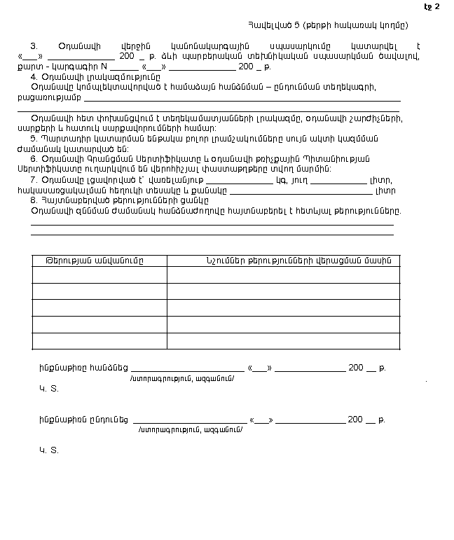 ՕԴԱՆԱՎԻ ԹՌԻՉՔԻ ԹՈՒՅԼՏՎՈՒԹՅՈՒՆ 1. գրանցման նիշերը Nationality and registration marks .................................... 2 օդանավի նշագրումը Manufacturer, manufacturer's designation of aircraft ........................................................................................ ........................................................................................ 3. սերիայի համարը Aircraft serial number .................................... 4. Թույլտվության բովանդակությունը .................................................................................................................. ................................................................................................................................................................................... The permit covers .................................................................................................................................................. ................................................................................................................................................................................... 5. Սահմանափակումներ/Նշումներ Limitation/ Remarks Սույնով ՀՀ կառավարությանն առընթեր քաղաքացիական ավիացիայի գլխավոր վարչությունը ՔԱԳՎ պետի 2004 թվականի դեկտեմբերի 9-ի N 192-Ն հրամանի համաձայն թույլ է տալիս տվյալ ինքնաթիռի ներքոհիշյալ հատուկ պայմաններով թռիչքը ՀՀ օդային տարածքում: Սույն թույլտվությունը գործում է նաև այլ երկրների օդային տարածքներում թռիչքներ իրականացնելու նպատակով՝ տվյալ երկրների համապատասխան մարմինների կողմից լրացուցիչ թույլտվության առկայության պայմանով: The General department of civil aviation at the government of the Republic of Armenia granted by virtue of the Order No. 192-Ն hereby permit noted aircraft to fly within the airspace of the Republic of Armenia. This permit is also valid for flight within other States provided separate approval is obtained from the competent authorities of such States. Թռիչքային պիտանիության վարչության պետ Director of Airworthiness Department Department........................................................................... (Ստորագրություն, Ազգանուն) (Signature, Name)