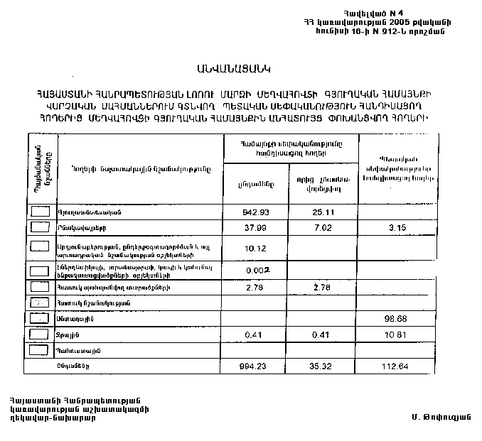 ա) Հայաստանի Հանրապետության Լոռու մարզի Մեղվահովտի գյուղական համայնքին անհատույց սեփականության իրավունքով փոխանցվող 994.23 հեկտար հողերից 35.32 հեկտարը մասնավորեցման ենթակա չէ.