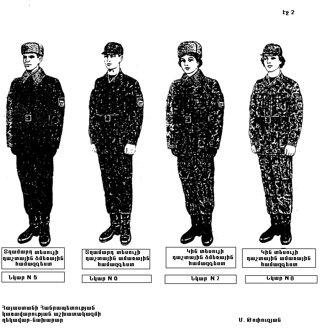 գ) տաբատ` կանաչավուն գույնի բրդյա կտորից, տաք ներդիրով, ուղիղ ուրվագծով, գոտին` գոտեմակօղերով, մետաքսե աստառով, կոճկվում է կոճակով և շղթայով: Արտաքին գրպանները` ուղիղ: Հետևամասի աջ կողմում կոճակով կոճկվող կափույրով գրպան (N 3 հավելված, նկար N 1),