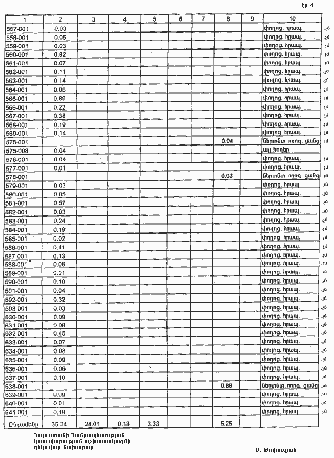 4. Ընդունել ի գիտություն Հայաստանի Հանրապետության Արագածոտնի մարզի Հարթավանի գյուղական համայնքի հողային ֆոնդի առկայության և բաշխման մասին հաշվետվությունը՝ 2005 թվականի հունվարի 1-ի դրությամբ՝ համաձայն NN 8 և 9 հավելվածների: