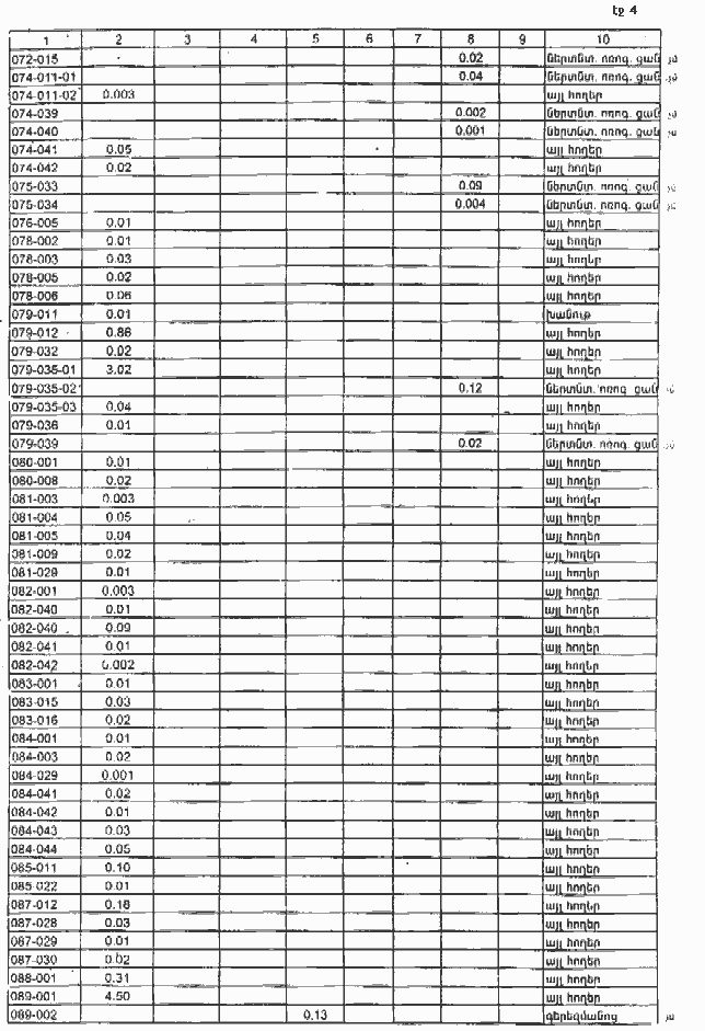 4. Ընդունել ի գիտություն Հայաստանի Հանրապետության Գեղարքունիքի մարզի Ծովինարի գյուղական համայնքի հողային ֆոնդի առկայության և բաշխման մասին հաշվետվությունը՝ 2005 թվականի հունվարի 1-ի դրությամբ՝ համաձայն NN 8 և 9 հավելվածների: