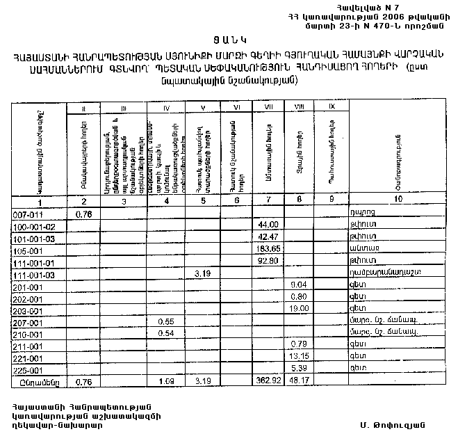 7. Հայաստանի Հանրապետության Սյունիքի մարզպետին` Հայաստանի Հանրապետության կառավարության 2000 թվականի հոկտեմբերի 23-ի N 656 որոշմամբ սահմանված կարգով` սկզբնական հաշվառման տվյալների հիման վրա ապահովել մարզի տարածքում ընթացիկ հաշվառման աշխատանքների իրականացումը: