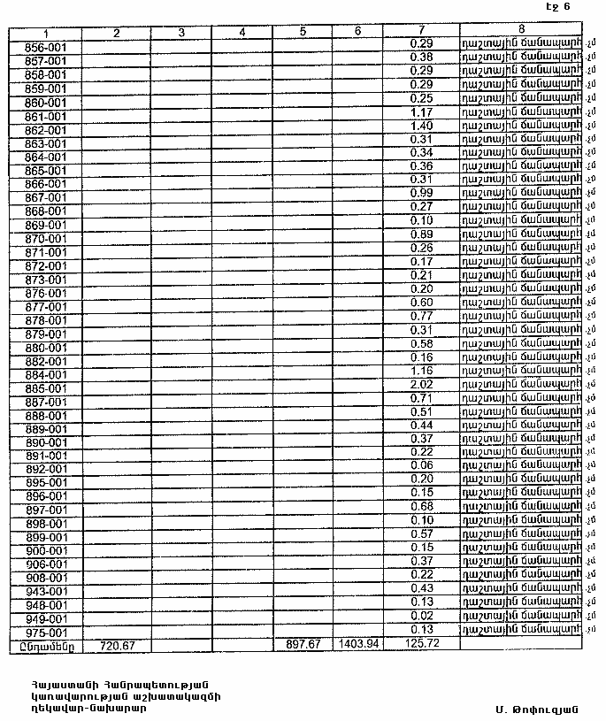 6. Թույլատրել Հայաստանի Հանրապետության կառավարությանն առընթեր անշարժ գույքի կադաստրի պետական կոմիտեի նախագահին Հայաստանի Հանրապետության պետական գեոդեզիական ցանցի հավասարակշռման արդյունքների հիման վրա Հայաստանի Հանրապետության վարչատարածքային միավորների սահմանանիշերի կոորդինատների ժողովածուի հրատարակումից հետո հողային ֆոնդի ընթացիկ հաշվառման ժամանակ Հայաստանի Հանրապետության Լոռու մարզի Տաշիրի քաղաքային համայնքի հողային հաշվեկշռում սահմանված կարգով կատարել համապատասխան փոփոխություններ: