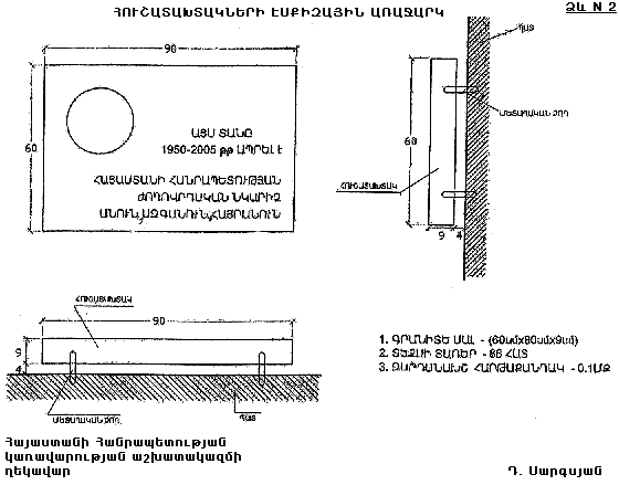 3.1. Մահացածի տան պատին հուշատախտակի տեղադրման հետ կապված գործընթացն իրականացվում է Հայաստանի Հանրապետության կառավարության 1999 թվականի օգոստոսի 31-ի «Հայաստանի Հանրապետությունում պետական և հասարակական նշանավոր գործիչներին նվիրված հուշարձանների իրականացման կարգը հաստատելու մասին» N 551 որոշմամբ սահմանված կարգով: