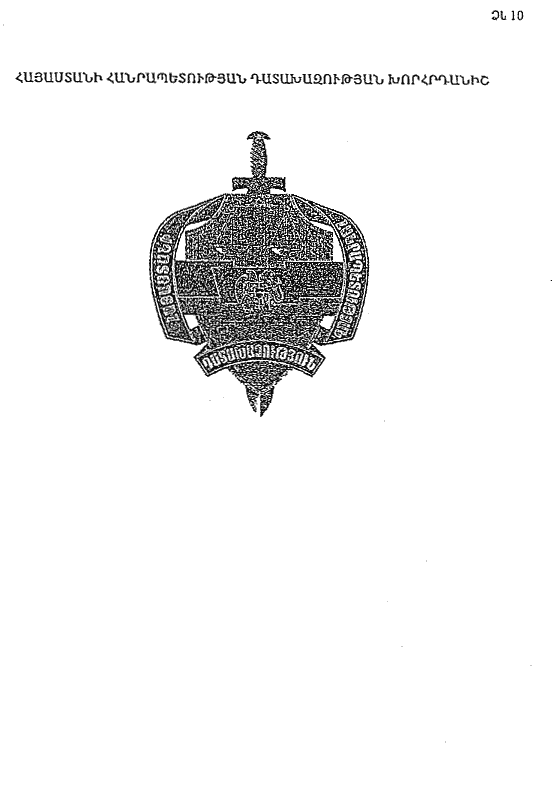 19. Հայաստանի Հանրապետության դատախազության խորհրդանիշի տարրերն են` վահանը, կշեռքը և սուրը: Վահանն ուղղահայաց հնգանկյուն է, որի վերևի մասում պատկերված է կշեռքը, իսկ կենտրոնում՝ Հայաստանի Հանրապետության դրոշը: Վերջինիս վրա տեղադրված է Հայաստանի Հանրապետության զինանշանը: Վահանից դուրս, վերևի մասում երևում է սրի բռնակը, իսկ ներքևից դուրս է գալիս սրի շեղբը: Վահանը երիզված է մուգ կապույտ ժապավենով, որի վրա ոսկեգույն տառերով մակագրված է «ՀԱՅԱՍՏԱՆԻ ՀԱՆՐԱՊԵՏՈՒԹՅԱՆ ԴԱՏԱԽԱԶՈՒԹՅՈՒՆ» (N 10 ձև):