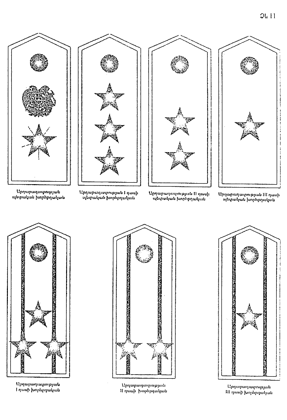24. Ուսադիրները պատրաստվում են արծաթյա թելից` մահուդե աստառի վրա: Ուսադիրների վրա` մեկ մուգ կանաչավուն մակաշերտ: 1-ին դասի խորհրդականի ուսադիրներին ամրացվում է 4 ոսկեգույն աստղ` յուրաքանչյուրը 13 մմ տրամագծով, 2-րդ դասի խորհրդականի ուսադիրներին` 3 ոսկեգույն աստղ` յուրաքանչյուրը 13 մմ տրամագծով, 3-րդ դասի խորհրդականի ուսադիրներին` 2 ոսկեգույն աստղ` յուրաքանչյուրը 13 մմ տրամագծով (N 12 ձև):