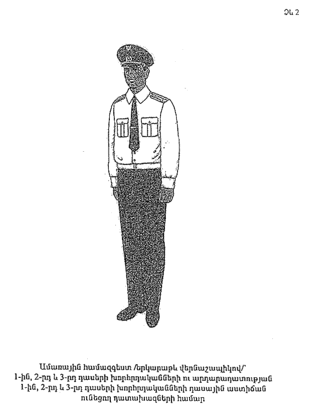 9. Վերնաշապիկ` կարճաթև` սպիտակ կտորից է, ծալովի օձիքով, կրծքամասում` կոճակով կոճկվող կափույրով և շերտակարով վրադիր գրպաններ: Ուղիղ գոտիով, կարագծերին էլաստիկ ժապավեններ: Հետևամասը` վերին կտրվածքով: Կոճկվում է 8 կոճակով: Ձախ կտրվածքը` շերտակարով: Թևքերը կարճ, ուղիղ թևքածալերով: Ուսերին` գոտեմակօղեր` ուսադիրների համար: Երկարաթև վերնաշապիկները կրում են բոլոր կոճակները կոճկված, փողկապով (NN 1 և 2 ձևեր), իսկ կարճաթև վերնաշապիկները` առանց փողկապի, ուսադիրներով, վերևի կոճակն արձակված (NN 3 և 4 ձևեր): Վերնաշապիկի օձիքը հետևից պետք է լինի կիտելի օձիքի վերին ծայրին հավասար, կամ դրանից ոչ ավելի, քան 0.5 սմ բարձր: Կանանց համար վերնաշապիկի ձևը նույնն է` դեպի ձախ կոճկումով: