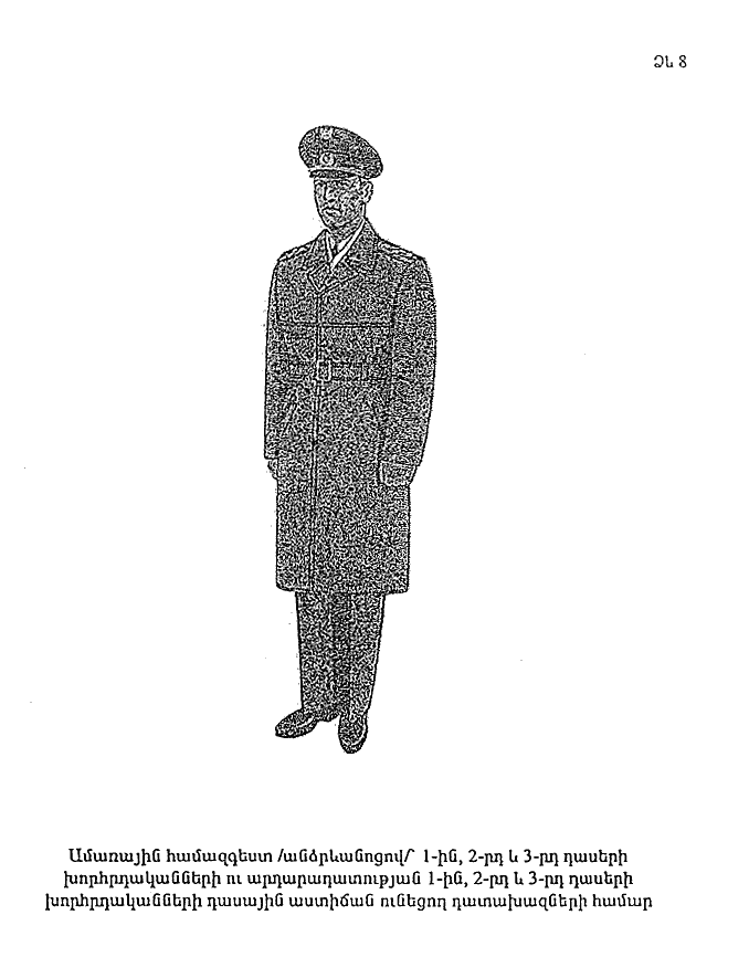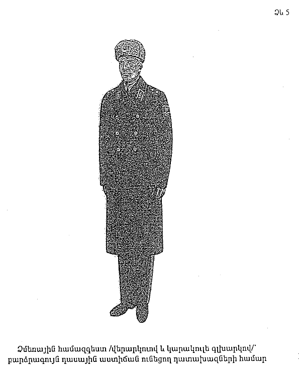 11. Վերարկու` ձմեռային, կիսաբրդյա` ունի 6 ոսկեգույն կոճակ` գրատախլակի վրա: Կոճակների միջև տարածությունը 16-17 սմ է: Բարձրագույն դասային աստիճան ունեցող դատախազների համար վերարկուն գորշ գույնի դրապից է, 1-ին, 2-րդ և 3-րդ դասերի խորհրդականների ու արդարադատության 1-ին, 2-րդ և 3-րդ դասերի խորհրդականների դասային աստիճաններ ունեցող անձանց համար` մուգ կապտագույն դրապից: Վերարկուն կրում են բոլոր կոճակները կոճկված, գրպանների կափույրները դուրս հանված: Հեռավորությունը գետնից միջև տղամարդու վերարկուի ներքևի փեշը պետք է լինի 40 սմ, կանանց վերարկուինը` 38-42 սմ: Վերարկուի հետ կրում են սպիտակ գույնի կաշնե (վզպատ) (NN 5 և 6 ձևեր):