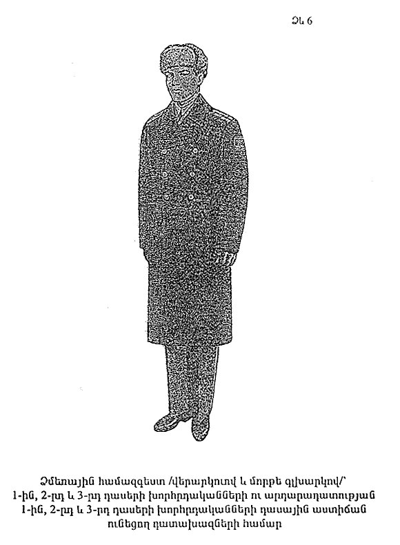 10. Փողկապ` սև` ունի լայնացած ուրվագծով ձևվածք: Պատրաստի տեսքն ավարտվում է ներքևում` սուր անկյունով, վերևում` մշտական հանգույցով: Օձիքի տակ ամրանում է էլաստիկ ժապավենով և ամրակով: Փողկապը վերնաշապիկին ամրացվում է սահմանված նմուշի ոսկեգույն ամրակով` վերևից 3-րդ և 4-րդ կոճակների միջև: