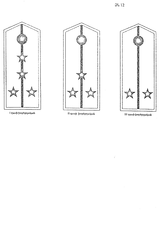 24. Ուսադիրները պատրաստվում են արծաթյա թելից` մահուդե աստառի վրա: Ուսադիրների վրա` մեկ մուգ կանաչավուն մակաշերտ: 1-ին դասի խորհրդականի ուսադիրներին ամրացվում է 4 ոսկեգույն աստղ` յուրաքանչյուրը 13 մմ տրամագծով, 2-րդ դասի խորհրդականի ուսադիրներին` 3 ոսկեգույն աստղ` յուրաքանչյուրը 13 մմ տրամագծով, 3-րդ դասի խորհրդականի ուսադիրներին` 2 ոսկեգույն աստղ` յուրաքանչյուրը 13 մմ տրամագծով (N 12 ձև):