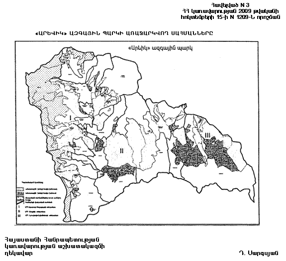 3) «Արևիկ» ազգային պարկի հողաշինարարական և անտառաշինական քարտեզների հիման վրա 2010 թվականի ընթացքում` սահմանված կարգով ապահովել «Արևիկ» ազգային պարկի տարածքի քարտեզագրումը, գոտևորման սխեմայի կազմումը, ազգային պարկի ու դրա պահպանման գոտու սահմանների ճշտումը և դրանք Հայաստանի Հանրապետության կառավարության կողմից հաստատվելուց հետո` հողամասերի ու ամրացված այլ գույքի նկատմամբ իրավունքների պետական գրանցումը.