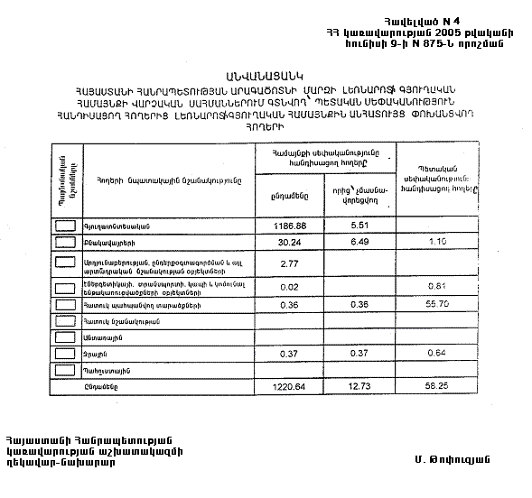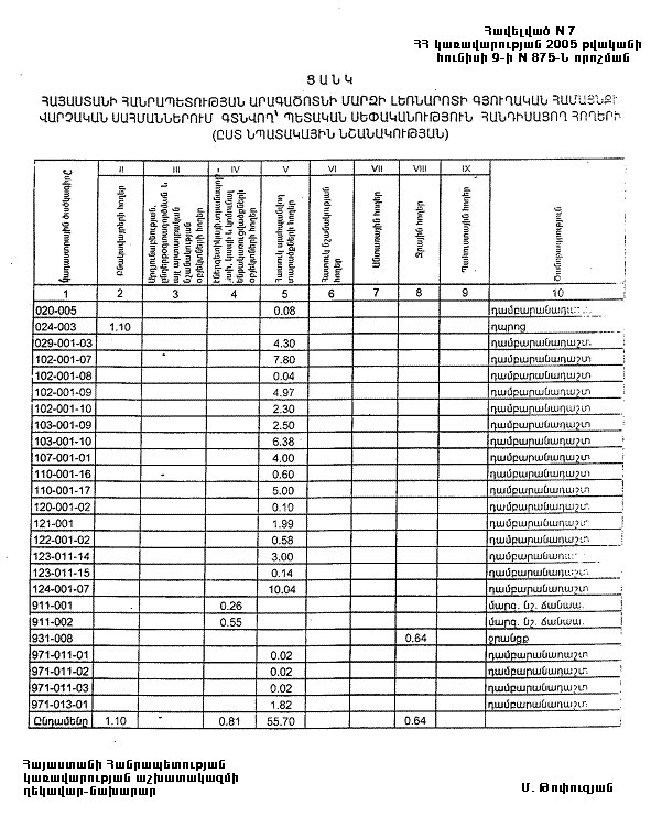 Հավելված N 7 ՀՀ կառավարության 2005 թվականի հունիսի 9-ի N 875-Ն որոշման |