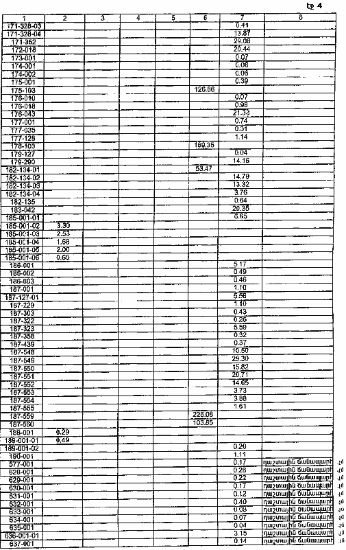 4. Ընդունել ի գիտություն Հայաստանի Հանրապետության Գեղարքունիքի մարզի Արծվանիստի գյուղական համայնքի հողային ֆոնդի առկայության և բաշխման մասին հաշվետվությունը` 2005 թվականի հունվարի 1-ի դրությամբ` համաձայն NN 8 և 9 հավելվածների: