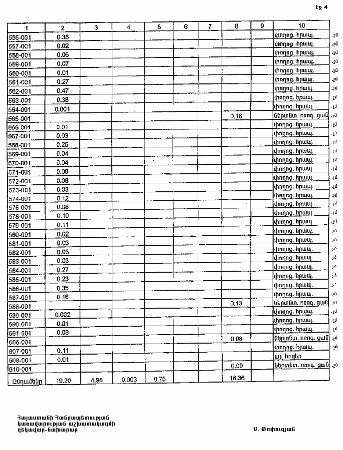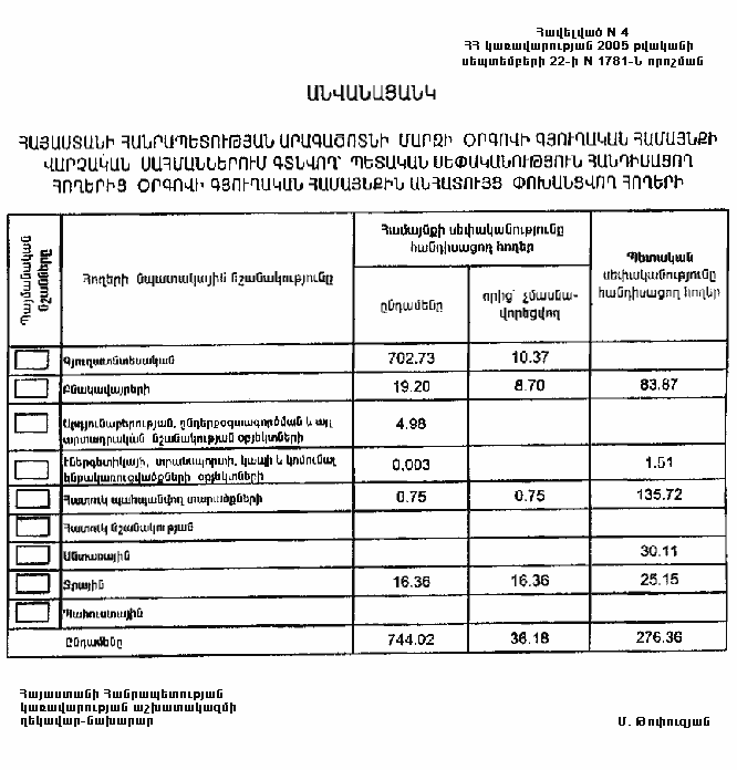 4. Ընդունել ի գիտություն Հայաստանի Հանրապետության Արագածոտնի մարզի Օրգովի գյուղական համայնքի հողային ֆոնդի առկայության և բաշխման մասին հաշվետվությունը՝ 2005 թվականի հունվարի 1-ի դրությամբ՝ համաձայն N 8 հավելվածի: