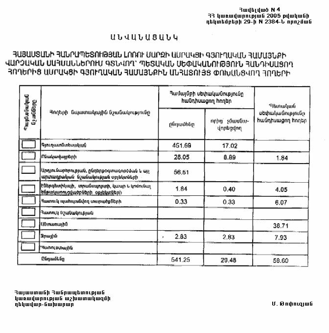 ա) Հայաստանի Հանրապետության Լոռու մարզի Ամրակցի գյուղական համայնքին անհատույց սեփականության իրավունքով փոխանցվող 541.25 հեկտար հողերից 29.48 հեկտարը մասնավորեցման ենթակա չէ.
