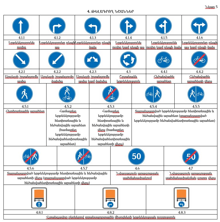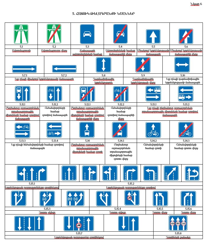 «52.20.1. 5.15.1-5.15.7 նշանների վրա պատկերված երթևեկության ուղղությունը ցույց տվող սլաքները կարող են ունենալ նաև այլ կոնֆիգուրացիաներ (ձևեր):»,