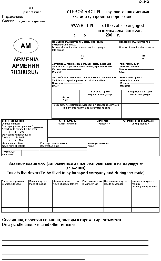 38. Թույլտվություն պահանջող միջպետական բեռնափոխադրումները Հայաստանի Հանրապետության տարածքից իրականացվում են միջազգային ճանապարհային թերթիկով (N 3 ձև):