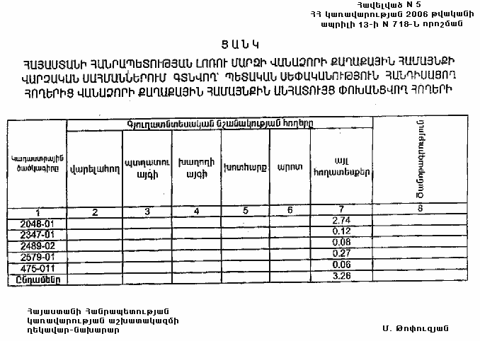 5. Հայաստանի Հանրապետության կառավարությանն առընթեր անշարժ գույքի կադաստրի պետական կոմիտեի նախագահին` սահմանված կարգով ապահովել սկզբնական հաշվառման նյութերի տրամադրումը Հայաստանի Հանրապետության Լոռու մարզի Վանաձորի քաղաքային համայնքի ղեկավարին` հողերի ընթացիկ հաշվառումն անցկացնելու և համայնքի հողային հաշվեկշիռը կազմելու համար: