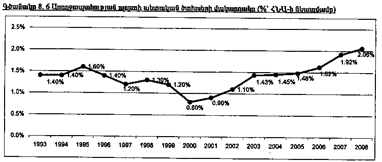 Միևնույն ժամանակ, կառավարությունը համոզված է, որ ոլորտի կապիտալ ծախսերի պահանջը անհամեմատ մեծ է: Այդուհանդերձ, հաշվի առնելով ոլորտի հզորությունների օպտիմալացմանն ուղղված ներկայումս ընթացող բարեփոխումները (հատկապես հիվանդանոցային բուժօգնության օղակում) և ոլորտի կապիտալ ծախսերի պլանավորման ու ֆինանսավորման մեխանիզմների հստակեցման անհրաժեշտությունը, կառավարությունը առայժմ ձեռնպահ է մնում առողջապահության ոլորտում լրացուցիչ կապիտալ ծախսերի եռամյա կտրվածքով ծրագրումից նկատի ունենալով համապատասխան հիմնավորվածության դեպքում կապիտալ ծախսերի շրջանակի չբաշխված բաղադրիչի հաշվին այդ ծախսերի ֆինանսավորման հնարավորությունը: