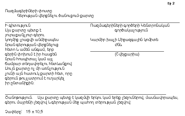 2. Ավիզոն կստորագրվի ռազմագերու կողմից, կամ եթե նա չի կարող գրել, ավիզոյի տակ տետք է դրվի ռազմագերու նշանը, և ավիզոն պետք է հաստատվի վստահված անձի կողմից: