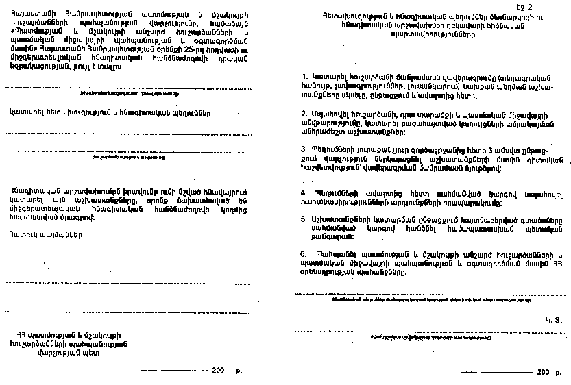 պատմության և մշակույթի անշարժ հուշարձանների պետական հաշվառման, ուսումնասիրման, պահպանության, ամրակայման, նորոգման, վերականգնման և օգտագործման | |