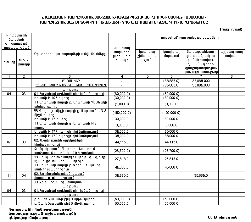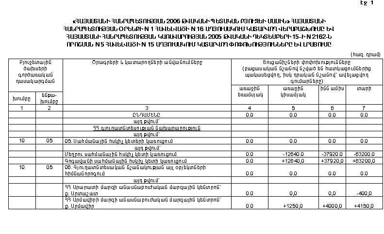 (Հավելվածները փոփ. Հավելված N 1, Հավելված N 1 N 15 աղյուսակ էջ1, 2, Հավելված N 1 N 16 աղյուսակ, Հավելված N 1 26.01.06 N 43-Ն, 26.01.06 N 63-Ն, 09.02.06 N 165-Ն, Հավելված 1 09.03.06 N 236-Ն, Հավելված N 1 N 16-րդ աղյուսակ էջ 1, 2 09.03.06 N 252-Ն, Հավելված N 1, Հավելված N 1 16-րդ աղյուսակ 09.03.06 N 418-Ն, Հավելված N 1, Հավելված N 5 23.09.06 N 398-Ն, Հավելված N 1 23.03.06 N 353-Ն, Հավելված N 1 N 1 աղյուսակ, Հավելված N 1 N 16 աղյուսակ 30.03.06 N 412-Ն, Հավելված N 1 30.03.06 N 427-Ն, Հավելված N 1, N 1 աղյուսակ էջ 1, 2, Հավելված N 1 N 24 աղյուսակ էջ 1, 2, 3 30.03.06 N 485-Ն, Հավելված N 1 06.04.06 N 517-Ն, Հավելված N 1 06.04.06 N 430-Ն, Հավելված N 1 N 1 աղյուսակ էջ 1, 2, 3, Հավելված N 1 N 16 աղյուսակ էջ 1, 2, 3, 4 06.04.06 N 414-Ն, Հավելված N 1 N 1 աղյուսակ էջ 1, 2, Հավելված N 1 N 16 աղյուսակ էջ 1, 2 13.04.06 N 518-Ն, Հավելված N 1 N 16 աղյուսակ 27.04.06 N 662-Ն, Հավելված N 1 27.04.06 N 553-Ն, Հավելված N 1 04.05.06 N 540-Ն, Հավելված N 1 N 16 աղյուսակ 04.05.06 N 541-Ն, Հավելված N 1 N 1 աղյուսակ 04.05.06 N 542-Ն, Հավելված N 1 11.05.06 N 664-Ն, Հավելված N 1, Հավելված N 1, N 16 աղյուսակ 18.05.06 N 657-Ն, Հավելված N 1 26.05.06 N 667-Ն, Հավելված N 1 N 1 աղյուսակ էջ 1, 2, 3, 4, 5 26.05.06 N 676-Ն, Հավելված N 1 N 1 աղյուսակ, Հավելված N 1 N 16 աղյուսակ 26.05.06 N 688-Ն, Հավելված N 1 16.06.06 N 832-Ն, Հավելված N 1, Հավելված N 1 N 17 աղյուսակ 16.06.06 N 847-Ն, Հավելված N 1 N 1 աղյուսակ, Հավելված N 1 N 24 աղյուսակ 22.06.06 N 926-Ն, Հավելված N 1 29.06.06 N 915-Ն, Հավելված N 1 N 1 աղյուսակ, Հավելված N 1 N 16 աղյուսակ, Հավելված N 1 N 22 աղյուսակ 06.07.06 N 933-Ն, Հավելված N 1 N 1 աղյուսակ 20.07.06 N 1009-Ն, Հավելված N 1 N 1 աղյուսակ 20.07.06 N 1011-Ն, Հավելված N 3 20.07.06 N 1027-Ն, Հավելված N 1, Հավելված N 1 N 16 աղյուսակ 27.07.06 N 1030-Ն, Հավելված N 1 N 1 աղյուսակ, Հավելված N 1 N 24 աղյուսակ 27.07.06 N 1062, Հավելված N 1 03.08.06 N 1380-Ն, Հավելված N 1, Հավելված N 1 N 16 աղյուսակ 27.07.06 N 1019-Ն, Հավելված N 1 N 1 աղյուսակ 10.08.06 N 1114-Ն, Հավելված N 1 N 1 աղյուսակ 24.08.06 N 1208-Ն, Հավելված N 1 N 24 աղյուսակ 24.08.06 N 1261-Ն, Հավելված N 1 N 16 աղյուսակ 31.08.06 N 1301-Ն, Հավելված N 1 31.08.06 N 1230-Ն, Հավելված N 1 N 16 աղյուսակ 14.09.06 N 1382-Ն, Հավելված N 1 N 1 աղյուսակ , Հավելված N 1 N 16 աղյուսակ 14.09.06 N 1360-Ն, Հավելված N 1 22.09.06 N 1353-Ն, Հավելված N 1 05.10.06 N 1459-Ն, Հավելված N 1 05.10.06 N 1394-Ն, Հավելված N 1 12.10.06 N 1418-Ն)