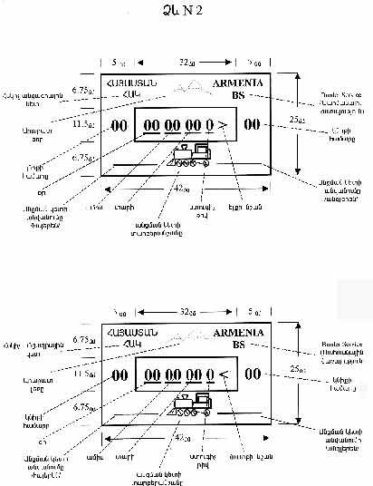 2. Հայաստանի Հանրապետության ազգային անվտանգության բնագավառի լիազորված պետական կառավարման մարմնի սահմանապահ զորքերի սահմանային վերահսկողության ստորաբաժանումների կողմից պետական սահմանի անցման կետերում առանց մուտքի վիզայի ռեժիմով Հայաստանի Հանրապետություն ժամանած օտարերկրացու անձնագրում` նշումների (վիզաների) համար նախատեսված էջում, դրվում է 42x25 մմ չափսերով ամսաթիվ-կնիքի դրոշմ, որը, կախված պետական սահմանի անցման կետի տեսակից, լինում է օդային (ձև N 1), երկաթուղային (ձև N 2) և ավտոմոբիլային (ձև N 3): Ամսաթիվ-կնիքի վրա հայերենով և անգլերենով նշված են «ՀԱՅԱՍՏԱՆ ՀԱԿ», «ARMENIA BS» բառերը, պետական սահմանի անցման կետի անվանումը, սահմանահատման ամսաթիվը, ստուգիչ համարը, ելքի կամ մուտքի նշանը, ամսաթիվ-կնիքի համարը (երկու կողմում), ինչպես նաև պատկերված են Արարատ լեռը և օդային, երկաթուղային կամ ավտոմոբիլային անցման կետի տարբերանշանը: