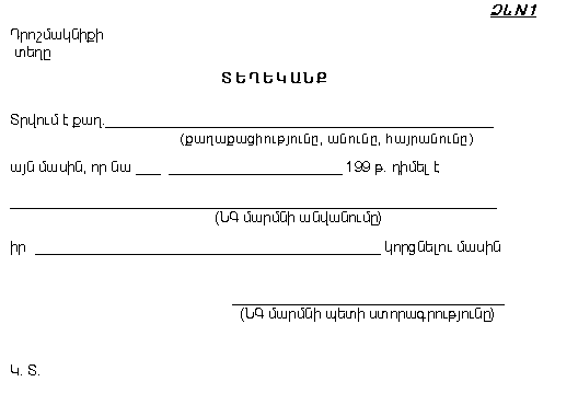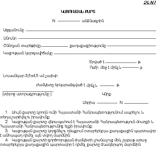 4. Հայաստանի Հանրապետությունում գտնվող օտարերկրյա քաղաքացիները պարտավոր են ունենալ իրենց ինքնությունը հաստատող` միջազգայնորեն ճանաչված փաստաթուղթ (այսուհետև` անձնագիր) և այն ներկայացնել Հայաստանի Հանրապետության ներքին գործերի կամ իրավասու այլ պետական մարմինների ներկայացուցիչների պահանջով: Օտարերկրյա քաղաքացին անձնագիրը կորցնելու մասին պետք է անհապաղ հայտնի ներքին գործերի համապատասխան մարմնին: Օտարերկրյա քաղաքացու խնդրանքով նրան կարող է տրվել անձնագիրը կորցնելու մասին տեղեկանք (N 1 ձևը կցվում է):