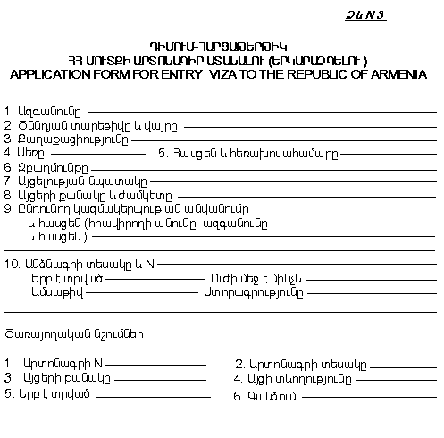 7. Հայաստանի Հանրապետություն մուտքի արտոնագիր ստանալու համար օտարերկրյա քաղաքացիները ներկայացնում են անձնագիր, Հայաստանի Հանրապետության արտաքին գործերի նախարարության կողմից հաստատված` պաշտոնական կամ Հայաստանի Հանրապետության ներքին գործերի նախարարության կողմից ձևակերպված անձնական հրավեր և լրացնում դիմում-հարցաթերթիկ (N 3 ձևը կցվում է):